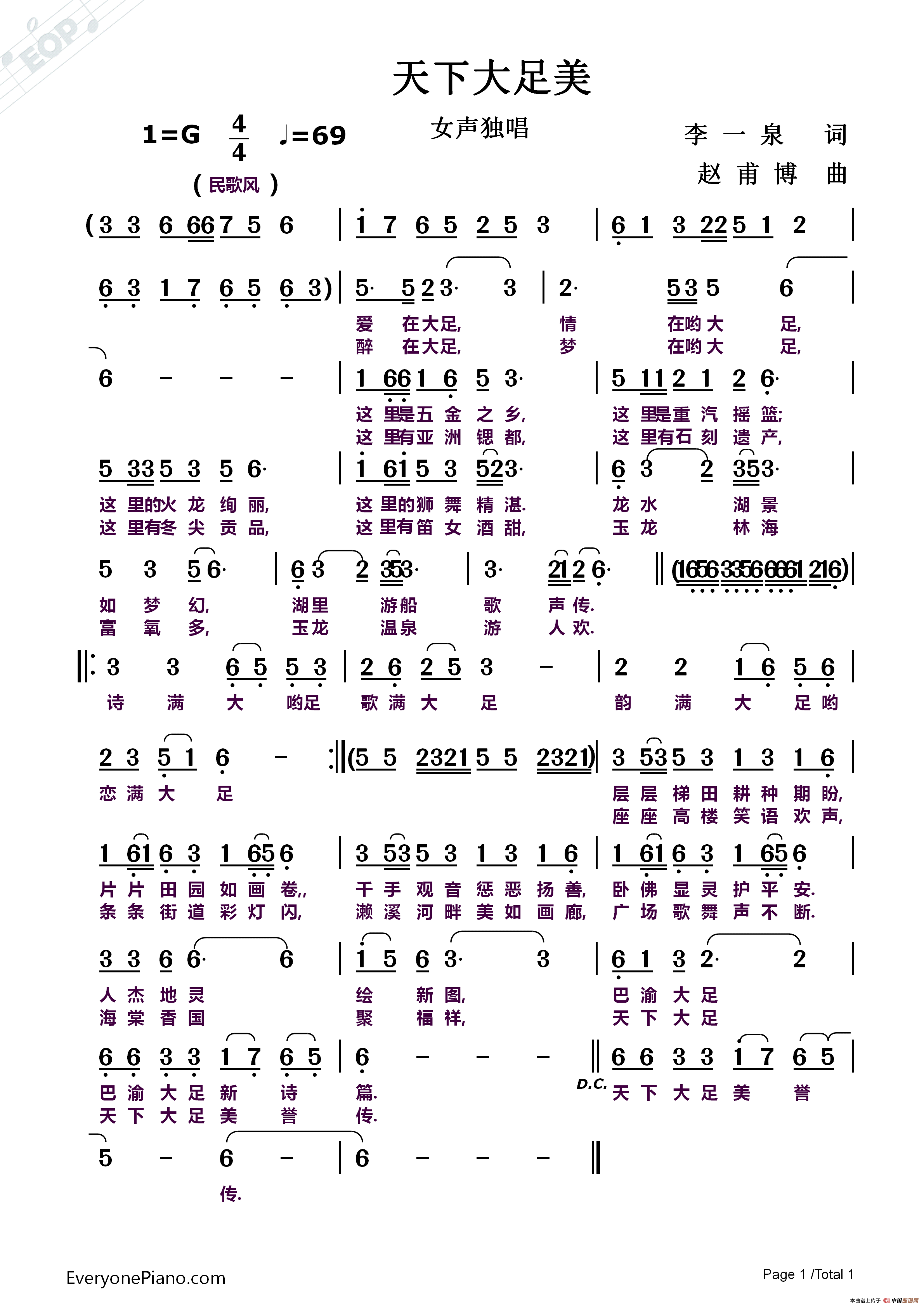 天下大足美简谱 赵甫博原创曲谱专栏 中国曲谱网