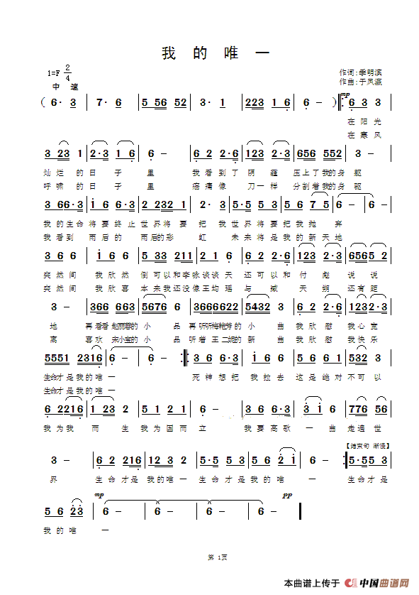 我的唯一简谱 于凤瀛原创曲谱专栏 中国曲谱网
