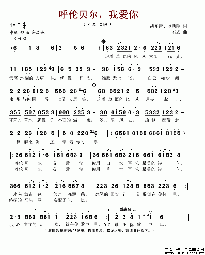呼伦贝尔,我爱你简谱 秋叶起舞个人制谱园地 中国曲谱网