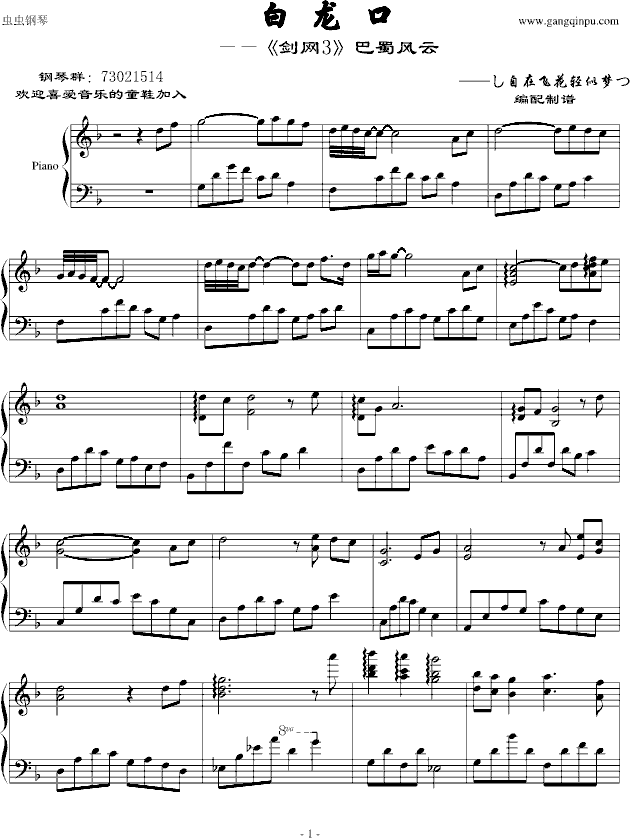 白龙口钢琴谱 F调独奏谱 剑侠情缘 钢琴独奏视频 原版钢琴谱 乐谱 曲谱 五线谱 六线谱 高清免费下载