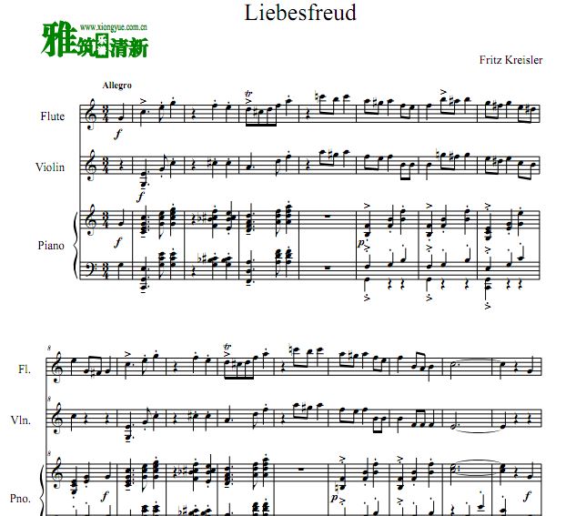 克莱斯勒 Liebesfreud 爱的喜悦长笛小提琴钢琴三重奏谱