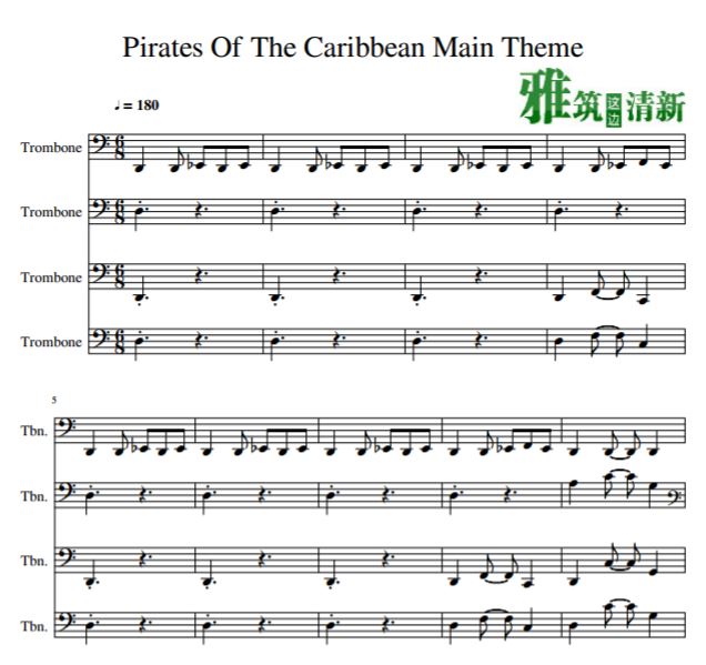 加勒比海盗主题曲pirates of the Caribbean长号四重奏谱