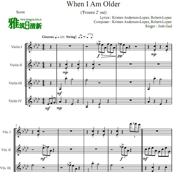 冰雪奇缘2 When I Am Older小提琴四重奏谱