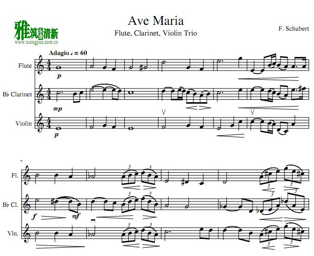 舒伯特Ave Maria 长笛单簧管小提琴三重奏谱