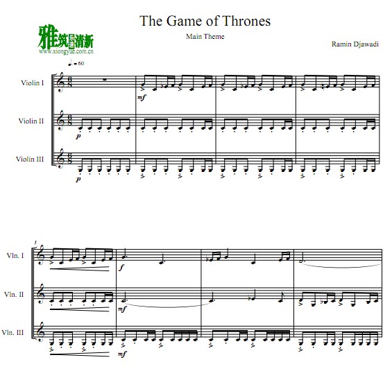权力的游戏主题曲小提琴大提琴钢琴三重奏谱