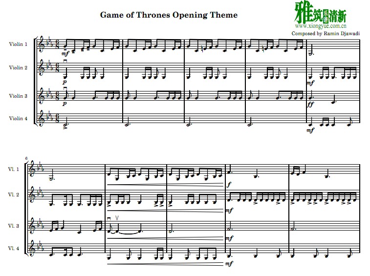 权力的游戏主题曲四小提琴四大提琴合奏谱