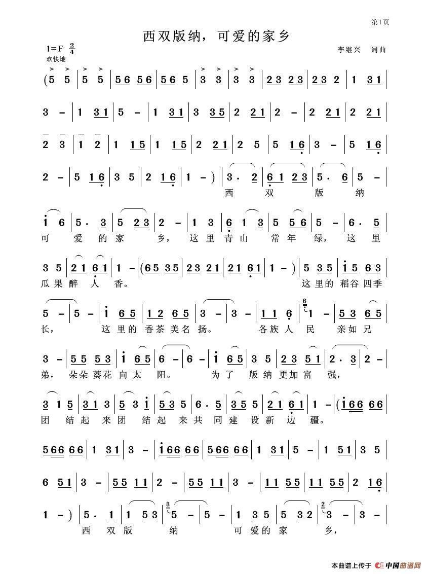 西双版纳简谱 芮彭年词 刘文斌曲 民歌曲谱 中国曲谱网